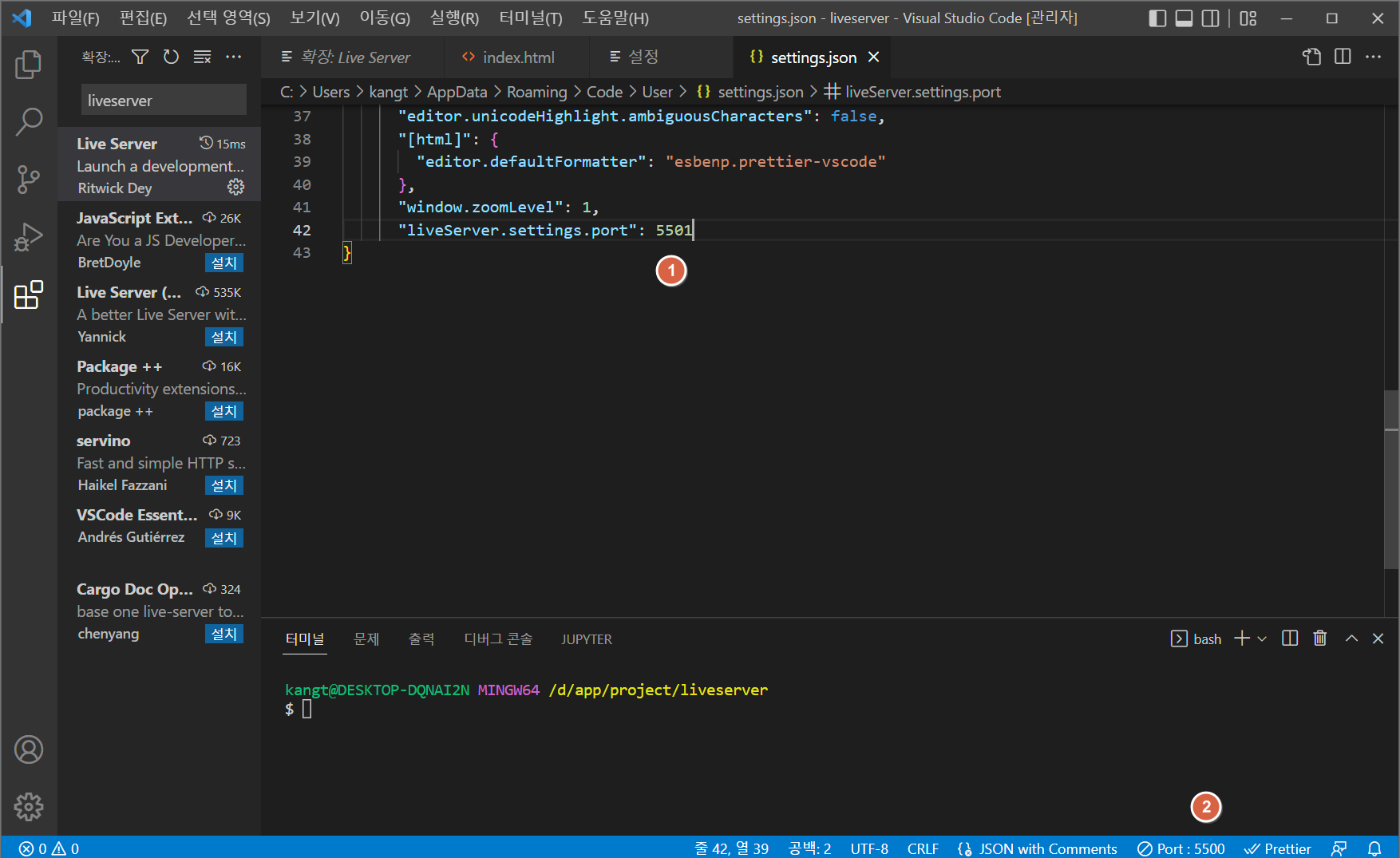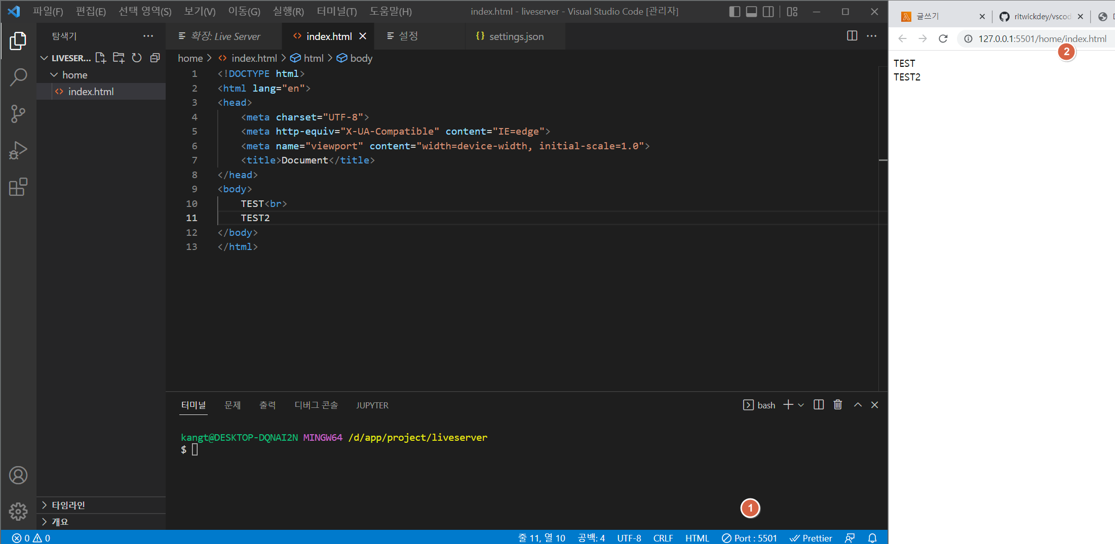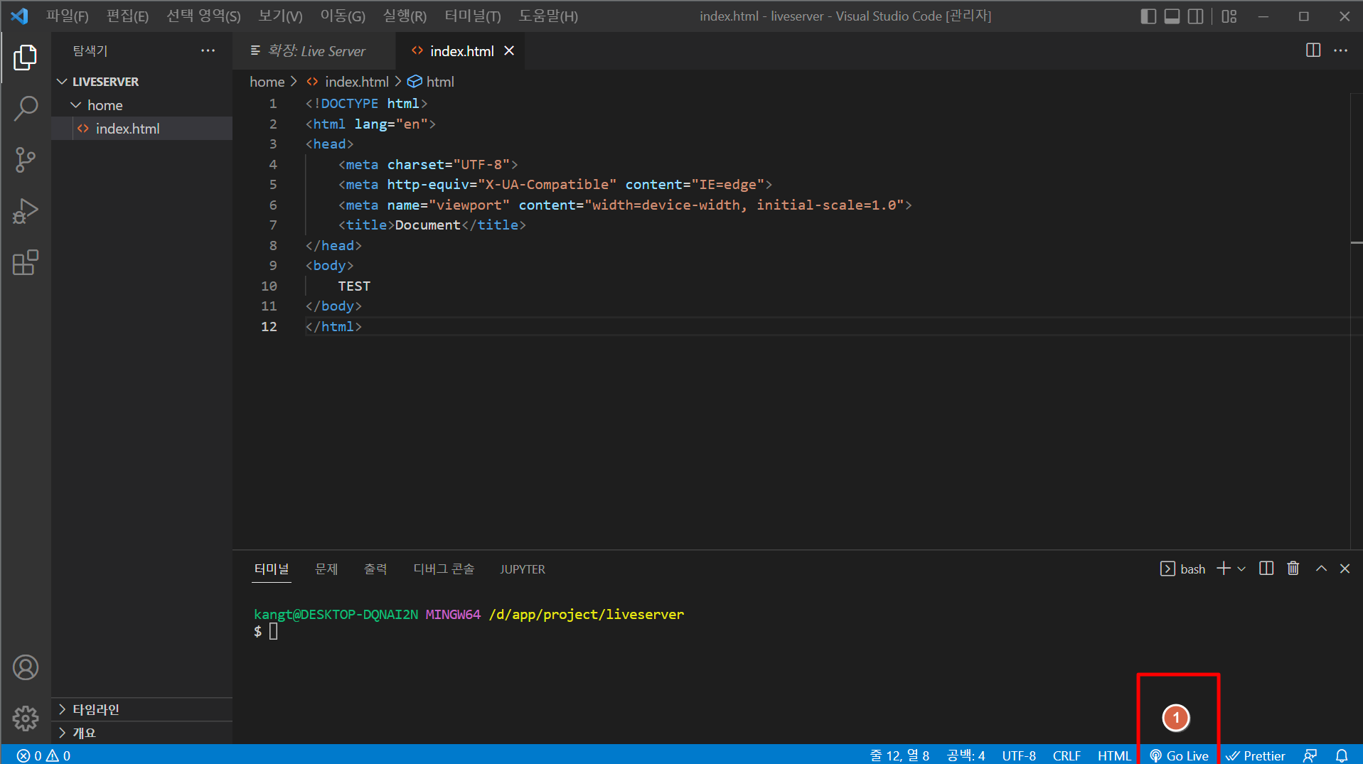 다음으로 위에 1번 쪽을 보면 vscode 하단에 [Go Live]를 클릭해서 Server on/off 가 가능하다.