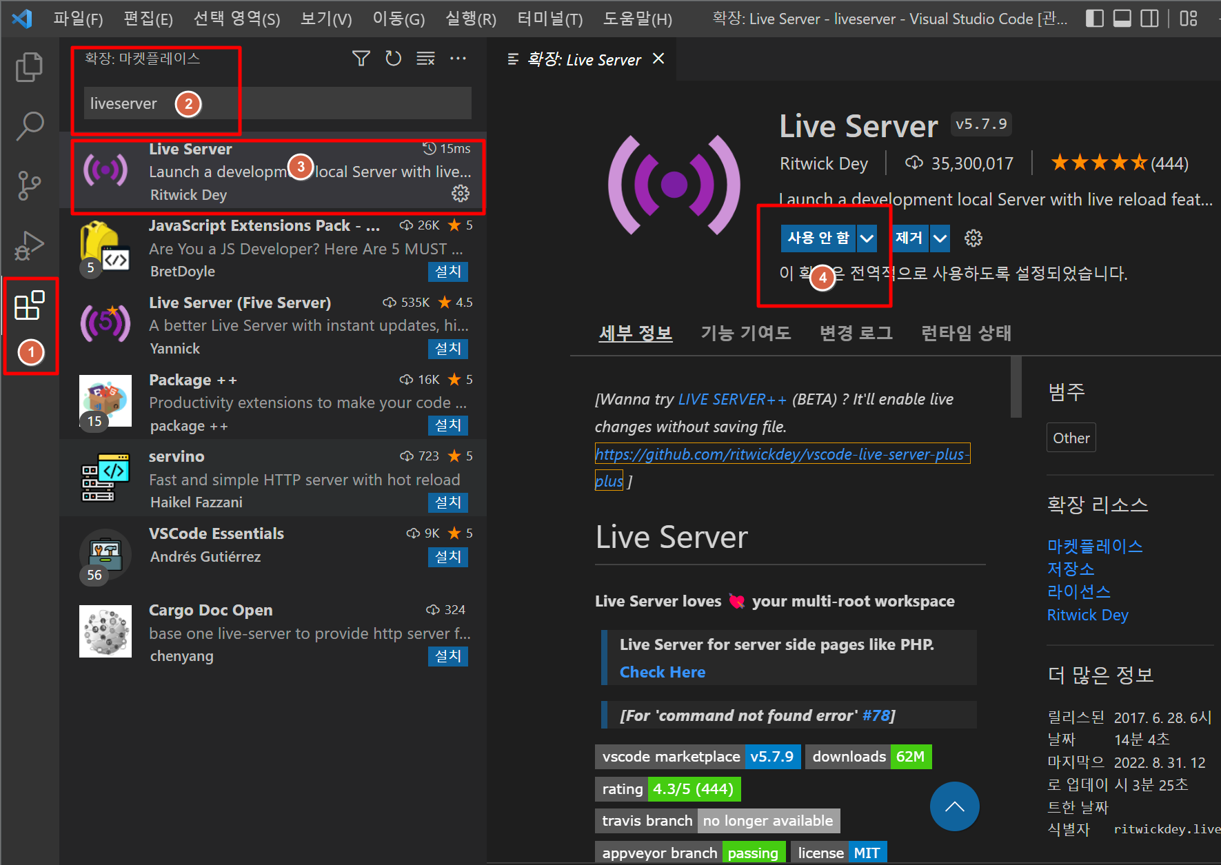 - vscode 왼쪽 확장 extension 아이콘 클릭