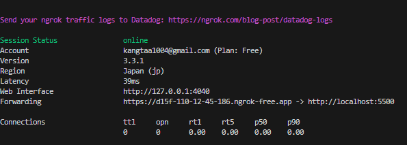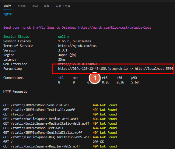 기존 터미널을 죽이고(?)... 다시 ngrok http 5500을 해본다.